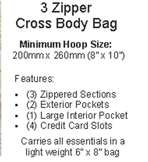 An embroidery design of a cross body bag featuring three zippered sections, two exterior pockets, a large interior pocket, and four credit card slots..