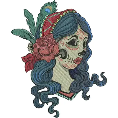 An embroidery design of a beautifully adorned skull lady featuring intricate facial patterns, flowing blue hair, and decorative floral elements..