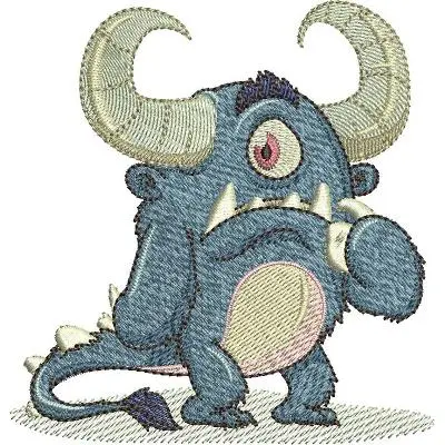 An embroidery design of a cute, blue monster with large horns, a single eye, and a playful expression..