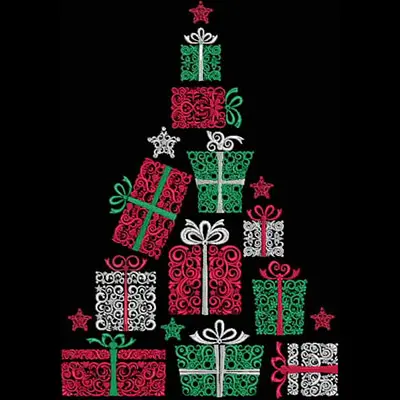 This digital machine embroidery design features a stylized Christmas tree made up of intricately patterned presents in red, green, and white, topped with stars. Available in all hoop sizes.