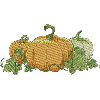This digital machine embroidery design features several pumpkins in varying shades of orange and green, accompanied by leafy vines. Available in all hoop sizes.