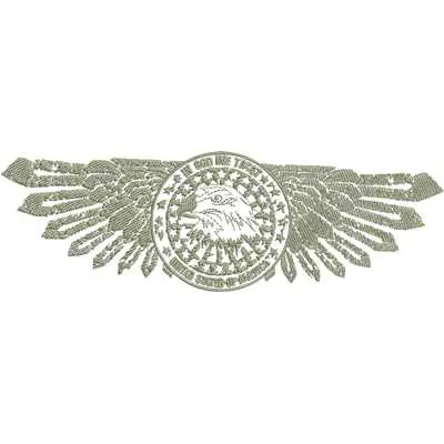 This digital machine embroidery design features intricately detailed eagle wings extending from a circular emblem featuring a stylized eagle in the center. Available in all hoop sizes.