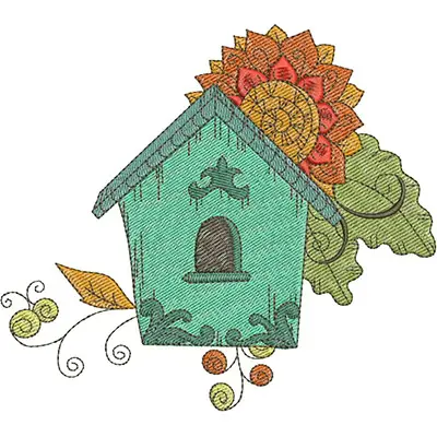 This digital machine embroidery design features a charming birdhouse adorned with a vibrant sunflower and leaf motifs. Available in all hoop sizes.
