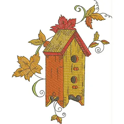 This digital machine embroidery design features a colorful birdhouse adorned with vibrant autumn leaves and swirling vines. Available in all hoop sizes.
