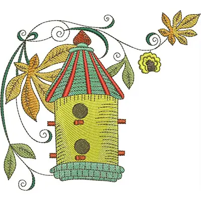 This digital machine embroidery design features a colorful birdhouse adorned with playful leaves and flowers. Available in all hoop sizes.