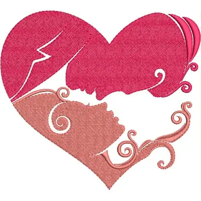 This digital machine embroidery design features two stylized faces forming a heart shape with intricate swirls and bold colors. Available in all hoop sizes.