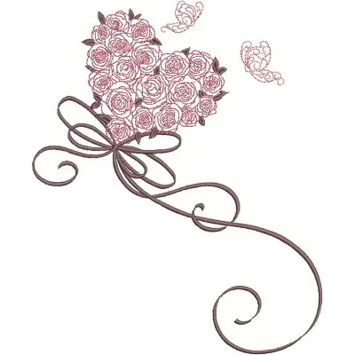 This digital machine embroidery design features a heart made of pink roses, adorned with a flowing ribbon and delicate butterflies. Available in all hoop sizes.