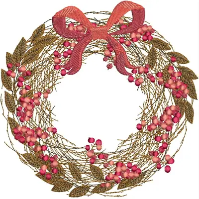This digital machine embroidery design features a decorative wreath made of intertwined branches, adorned with pink flowers and topped with a pink ribbon bow. Available in all hoop sizes.