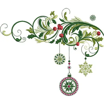 This digital machine embroidery design features elegant swirling vines adorned with holly, berries, and decorative ornaments including a snowflake and circular motifs. Available in all hoop sizes.