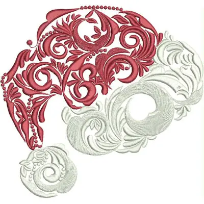 This digital machine embroidery design features intricate swirling patterns in red and white, showcasing elegant floral motifs and detailed curves. Available in all hoop sizes.