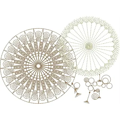 This embroidery design features intricate circular patterns featuring spirals and concentric motifs in varying shades. Available in all hoop sizes.