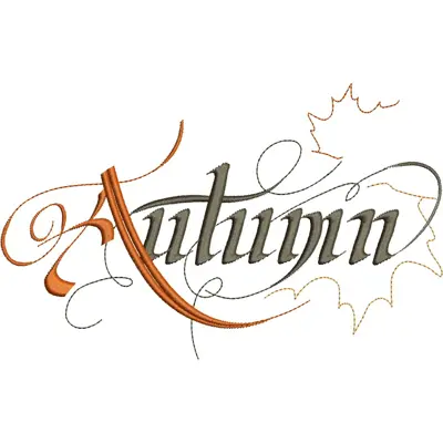 This digital machine embroidery design features the word "Autumn" adorned with elegant swirls and a maple leaf in warm shades of brown and orange. Available in all hoop sizes.