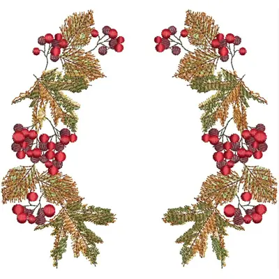 This embroidery design features vibrant red berries surrounded by delicate green and golden leaves. Available in all hoop sizes.