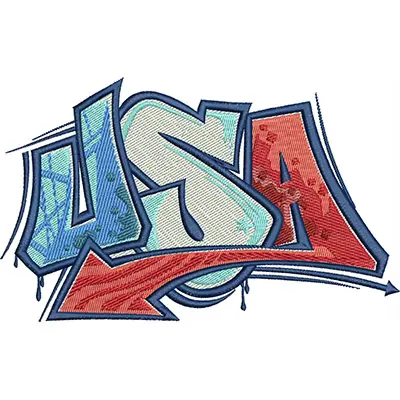 This digital machine embroidery design features the letters "USA" stylized in a bold graffiti style with vibrant colors and dynamic shapes. Available in all hoop sizes.