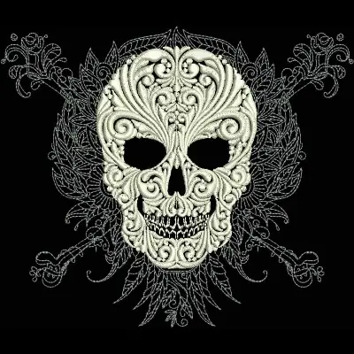 This digital machine embroidery design features an intricately detailed skull adorned with swirling floral patterns and decorative elements. Available in all hoop sizes.