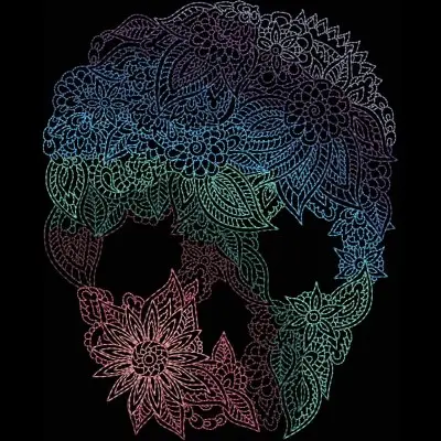 This digital machine embroidery design features a stylized skull adorned with intricate floral patterns and leaf motifs in vibrant colors. Available in all hoop sizes.