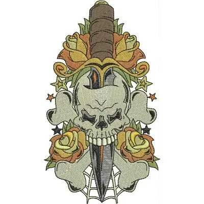 This digital machine embroidery design features a skull with a dagger through it, surrounded by roses and decorative elements. Available in all hoop sizes.