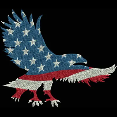 This digital machine embroidery design features an eagle adorned with the American flag, featuring stars and stripes in a vivid color palette. Available in all hoop sizes.