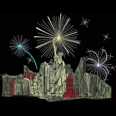 This digital machine embroidery design features the Statue of Liberty surrounded by colorful fireworks and a city skyline. Available in all hoop sizes.