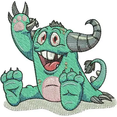 This digital machine embroidery design features a playful, cartoon-style monster with large eyes, clawed hands, and a cheerful expression. Available for 5X5 hoops.