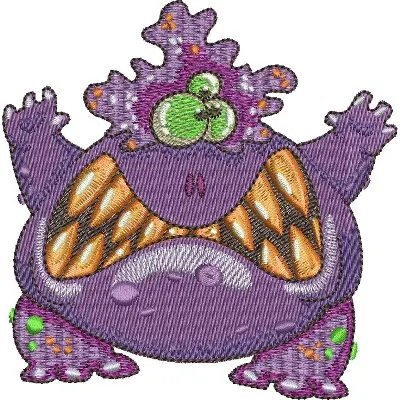 This embroidery design features a cartoonish purple monster with a wide grin, large teeth, and colorful spots. Available for 5X5 hoops.