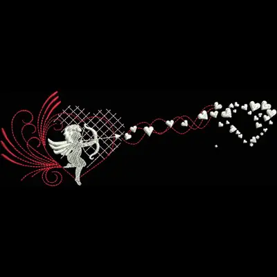 This digital machine embroidery design features a whimsical angel with wings shooting a trail of hearts from a decorative heart backdrop. Available in all hoop sizes.