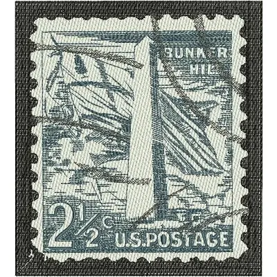 This digital machine embroidery design features a vintage postage stamp featuring a tall monument and a ship, with intricate detailing in blue and white. Available in all hoop sizes.