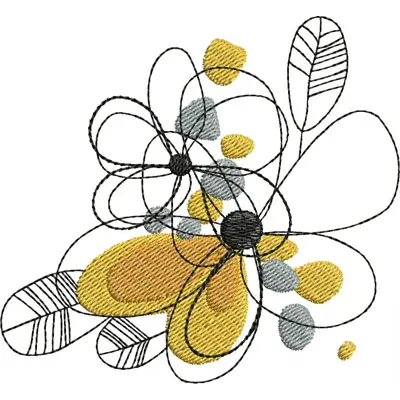 This digital machine embroidery design features stylized flowers with black outlines, yellow, grey, and black accents, featuring delicate leaves and circular elements.