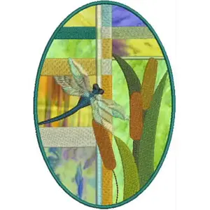 An embroidery design of a dragonfly perched among stylized cattails, featuring vibrant colors and a mix of geometric and organic shapes..
