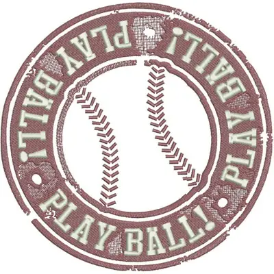 This digital machine embroidery design features a circular patch featuring the phrase "Play Ball!" with a baseball graphic in the center. Available in all hoop sizes.