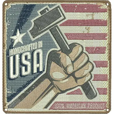 This digital machine embroidery design features a raised fist holding a hammer, accompanied by the text "Handcrafted in USA." Available in all hoop sizes.
