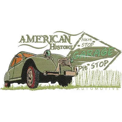 This embroidery design features a vintage car alongside text elements indicating "American History," "Garage," and "Pit Stop." Available in all hoop sizes.