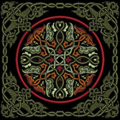 This digital machine embroidery design features an intricate circular pattern featuring vibrant colors and symmetrical floral motifs, framed by a decorative knotwork border. Available in all hoop sizes.