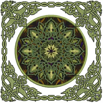 This digital machine embroidery design features an intricate circular pattern featuring vines and floral motifs surrounded by a decorative Celtic knot border. Available in all hoop sizes.