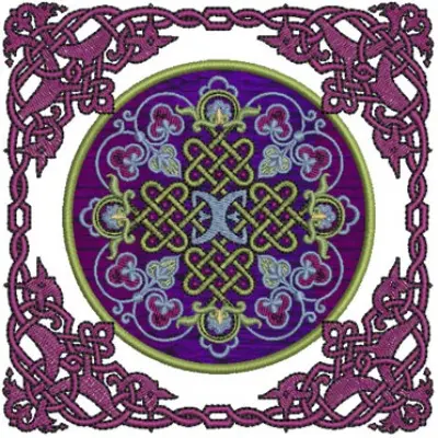 This digital machine embroidery design features an intricate circular pattern featuring vibrant knots and floral elements, enclosed by a decorative border. Available in all hoop sizes.