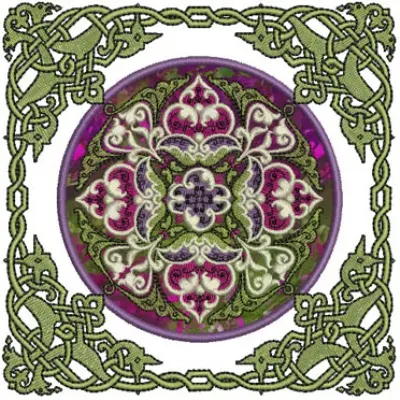 This embroidery design features a circular floral motif surrounded by intricate knotwork, featuring vibrant colors like green, purple, and white.
