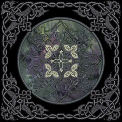 This digital machine embroidery design features an intricate circular pattern featuring delicate butterflies and intertwining floral motifs, framed by an ornate border. Available in all hoop sizes.