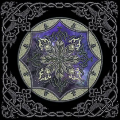 This digital machine embroidery design features an intricate eight-pointed star surrounded by a decorative border featuring elegant knots and swirling patterns. Available in all hoop sizes.