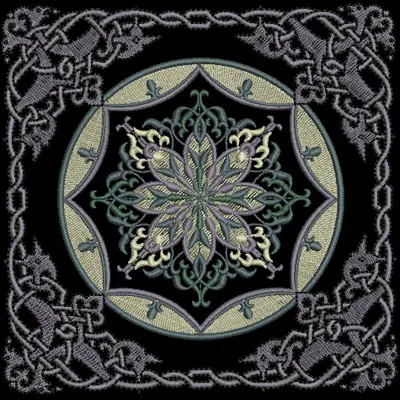This digital machine embroidery design features an intricate floral motif surrounded by a decorative border, featuring a blend of green, cream, and lavender colors. Available in all hoop sizes.
