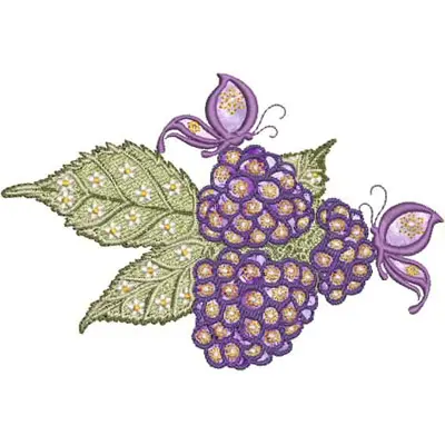 This digital machine embroidery design features vibrant purple berries accompanied by delicate leaves and a butterfly. Available in all hoop sizes.