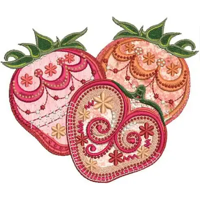 This embroidery design features three decorative strawberries featuring intricate patterns and vibrant colors. Available in all hoop sizes.