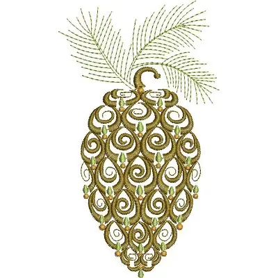 This embroidery design features a decorative pinecone adorned with intricate swirls and accentuated by green leaves. Available in all hoop sizes.
