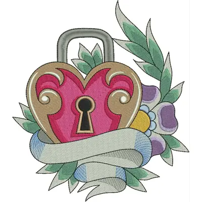 This digital machine embroidery design features a heart-shaped padlock surrounded by leaves and flowers, featuring a ribbon at its base. Available in all hoop sizes.