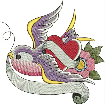 This digital machine embroidery design features a colorful bird flying with a heart and a floral accent, adorned with a flowing ribbon. Available in all hoop sizes.