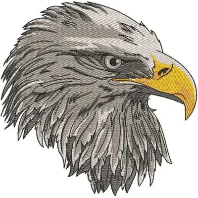 This digital machine embroidery design features a detailed eagle's head, showcasing intricate feathers and a striking yellow beak. Available in all hoop sizes.