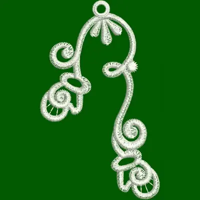 This digital machine embroidery design features intricate swirls and loops, elegantly styled with a delicate floral accent at the top. Available in all hoop sizes.