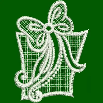 Digital machine embroidery design "ASOC Present 3" in the christmas theme for 2x2, 4x4 and 5x5 hoops an embroidery design of an intricate lace bow embellished with flowing ribbons and decorative elements. from Kreations by Kara.