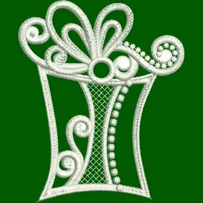This digital machine embroidery design features an ornate gift box with elegant swirls, ribbons, and decorative accents. Available in all hoop sizes.