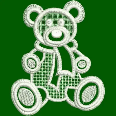 This digital machine embroidery design features a cute teddy bear sitting, outlined in white with a scarf. Available in all hoop sizes.