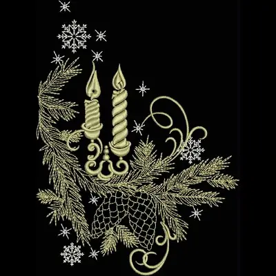 This digital machine embroidery design features two elegant candles surrounded by pine branches, cones, and delicate snowflakes. Available in all hoop sizes.